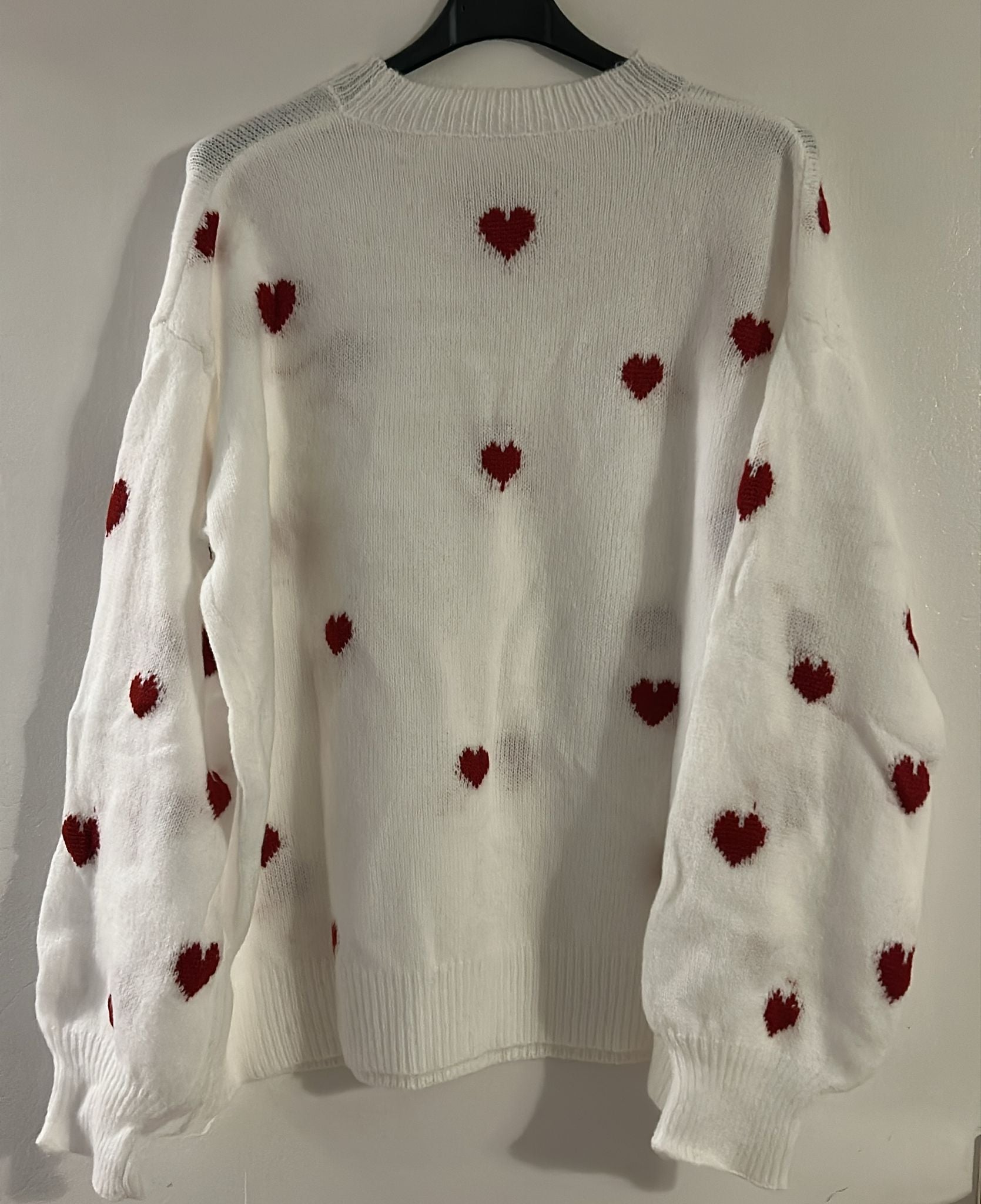 Der Herzchen Cozy Knit ist der perfekte Wohlfühlpullover für alle, die süße Details lieben. Der weiche Strickpullover in strahlendem Weiß ist rundum mit kleinen roten Herz-Motiven verziert und sorgt sofort für einen liebevollen, verspielten Look.